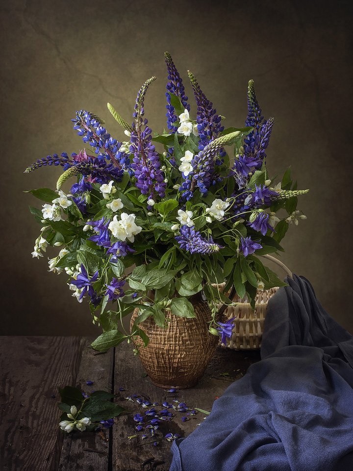 натюрморт, лето, букет, цветы, жасмин, люпин, корзинка, кувшин, Ирина Приходько