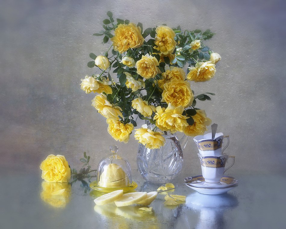 натюрморт, лето, капли дождя, стекло, букет роз, желтые розы, чайная посуда, лимон, Ирина Приходько