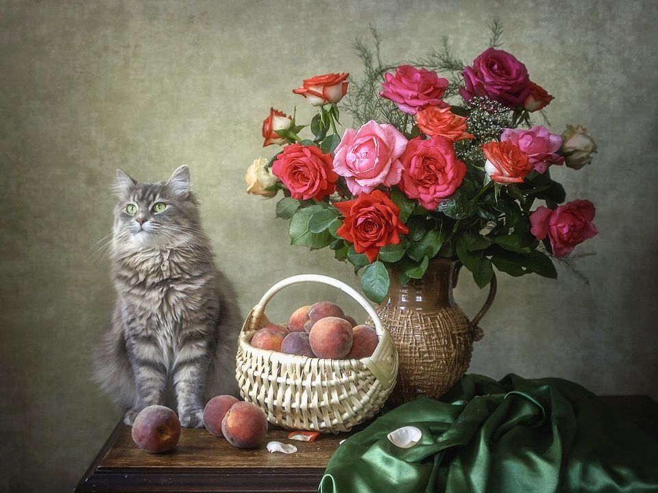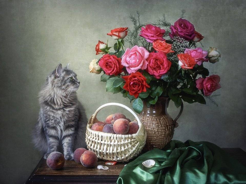 цветочный натюрмортлетобукет садовых розкорзина персиковкошка Масяня