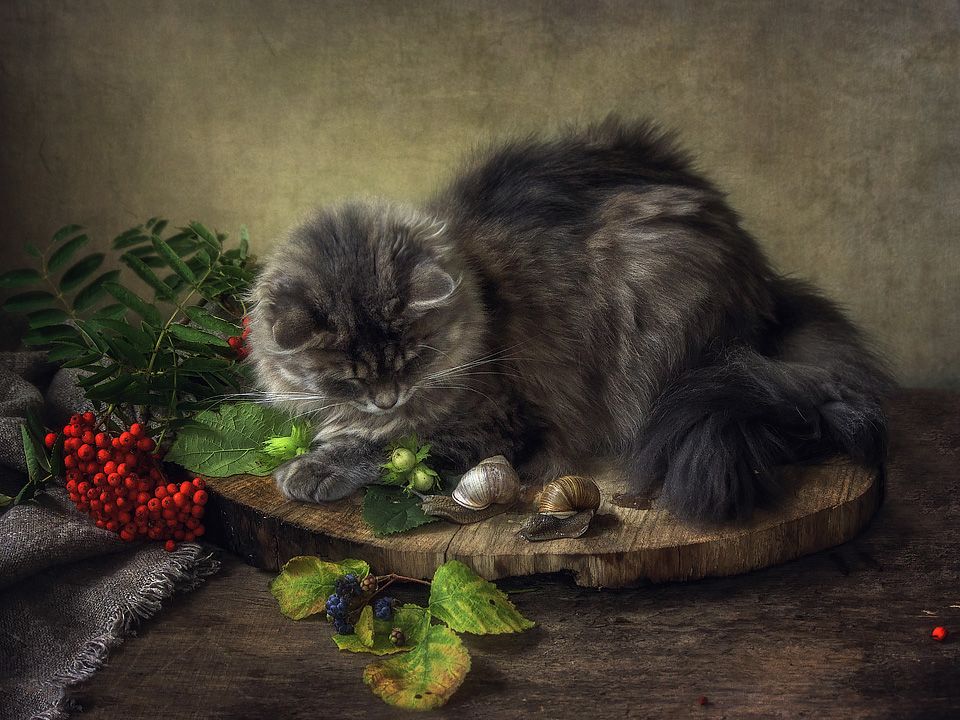 Саш, она теперь у меня сама решает, где будет сниматься, а где - нет. Этот сюжет придумала она сама, заняв место корзины с грибами и начав играть с улитками.