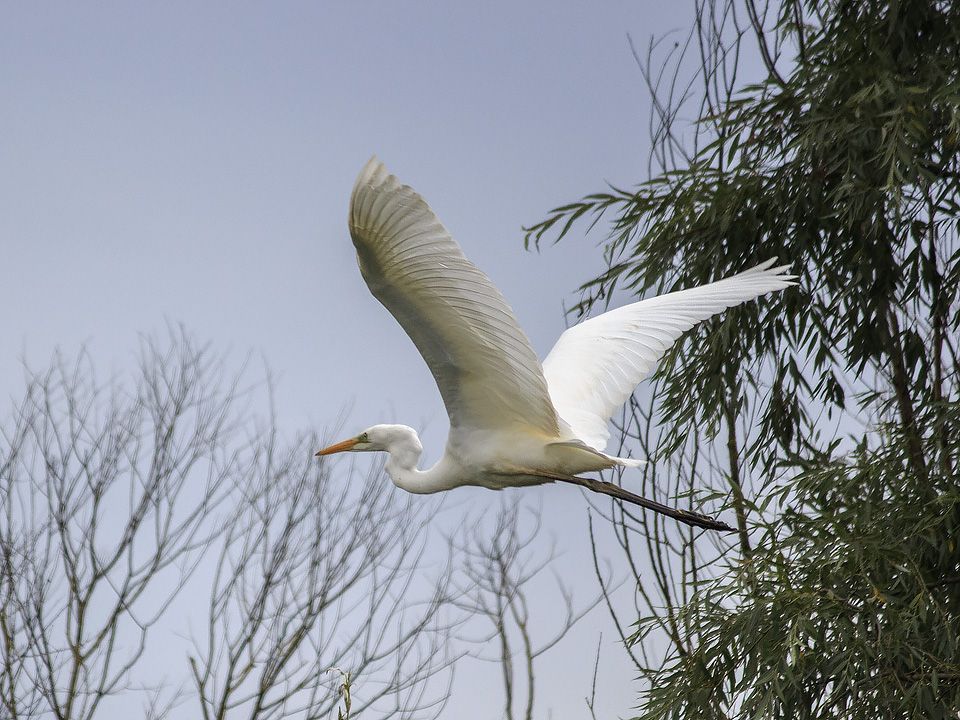 Большая белая цапля, гнездующая в Белорусском Полесье, очень осторожная птица. Эта, по видимому, что-то знает об интернете, захотела всемирной славы. Она очень близко подпускала нас на лодке, а потом величественно взлетала, каждый раз по разному. Прошу не судить строго качество снимков, техника у меня очень бюджетная.