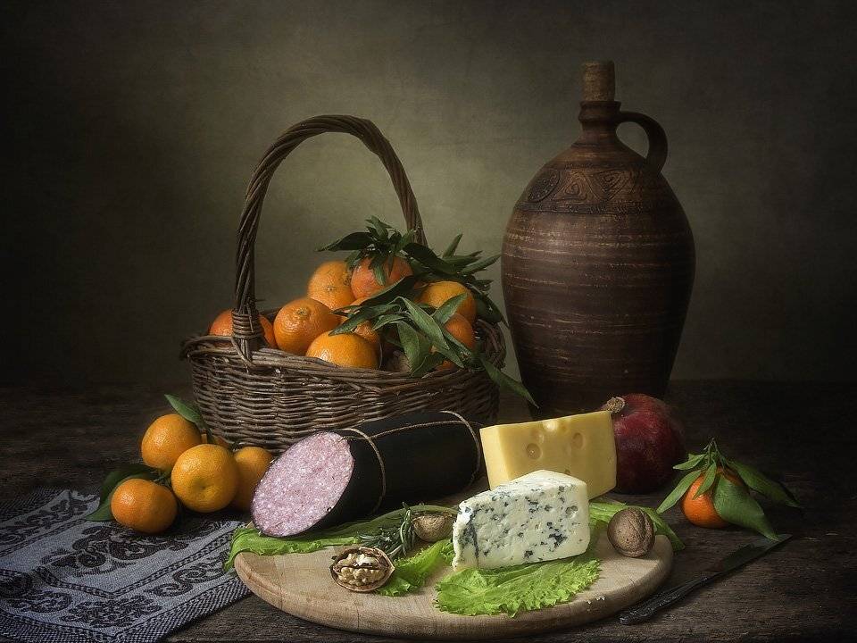 натюрмортхудожественное фотоделикатесыфруктыколбасасырымандарины