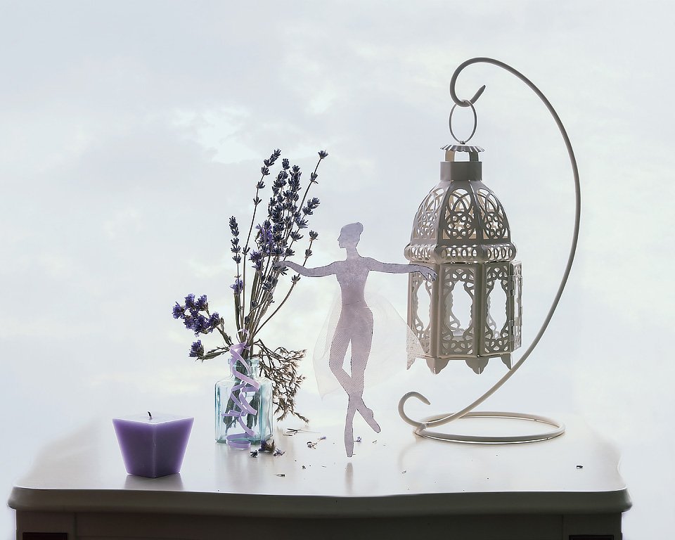 натюрморт, ожидание весны, лаванда, интерьер, фигурка балерины, фонарь, свеча, воздушность, небесный фон, Ирина Приходько