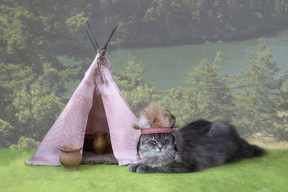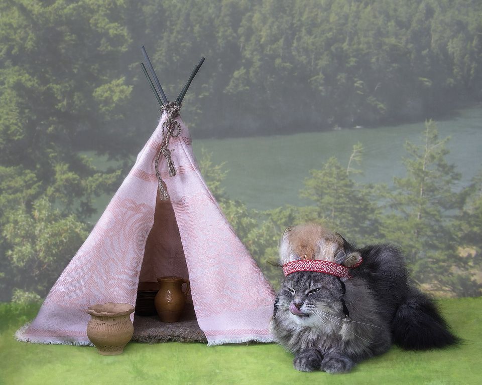 Масяня у нас такая резвая и хулиганистая кошечка, что у меня возникла идея создать для нее образ "Вождь Краснокожих", но когда был готов головной убор и вигвам, она так царственно приняла этот антураж, что я решила - будет принцесса Покахонтас. Собственно, и это имя переводится, как "шалунья"