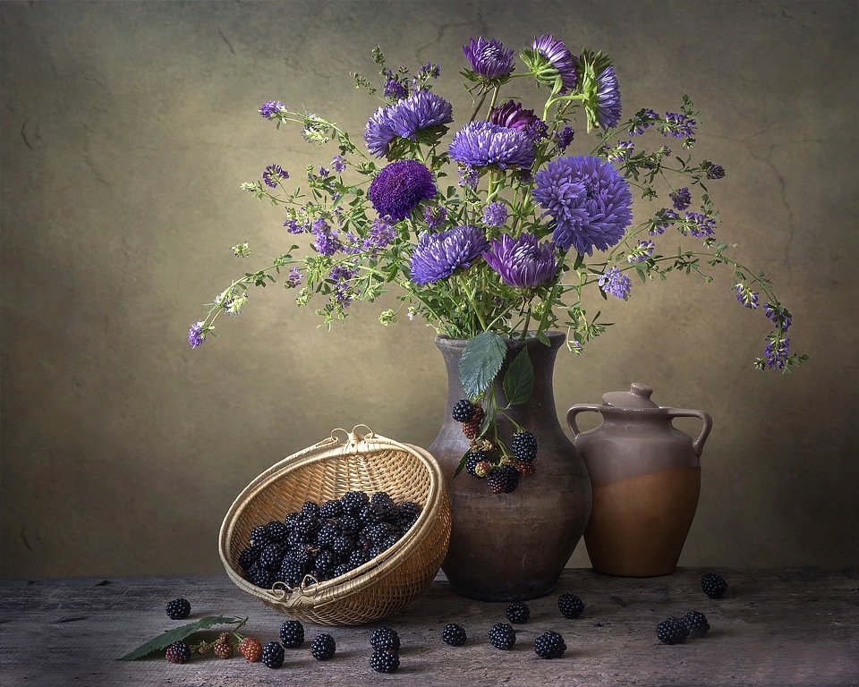натюрморт, цветы, букет, осень, астры, фиолетовые, ежевика, Ирина Приходько