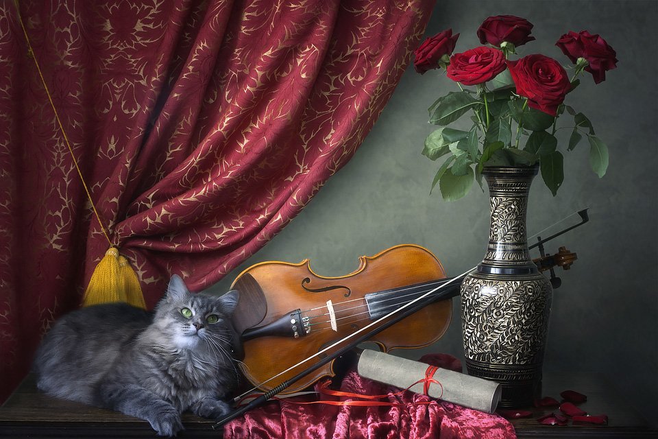натюрморт, скрипка, букет роз, кошка Масяня, интерьер, Ирина Приходько