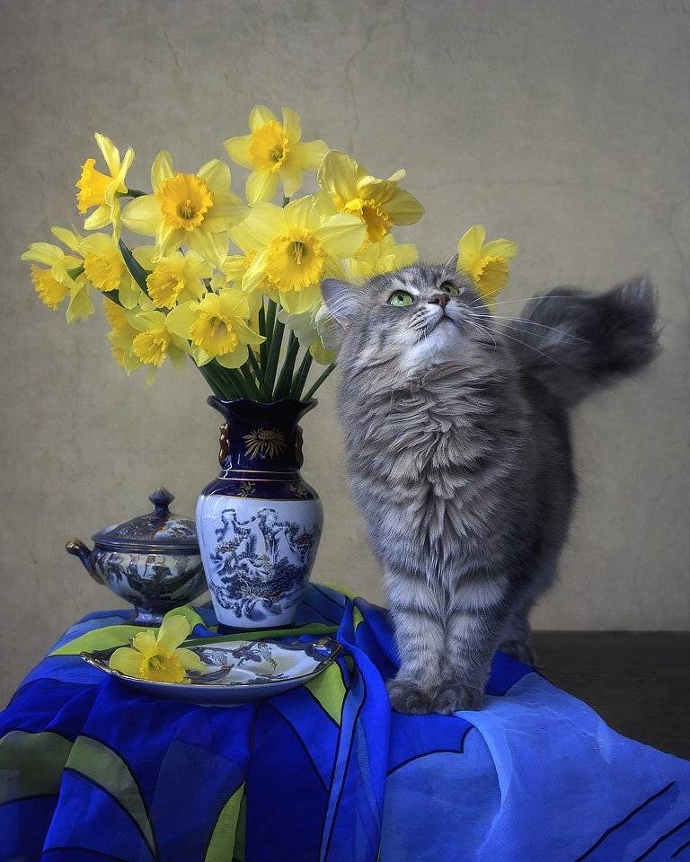 домашние животныекошка Масяняцветывеснабукетынатюрморт желтые нарциссы