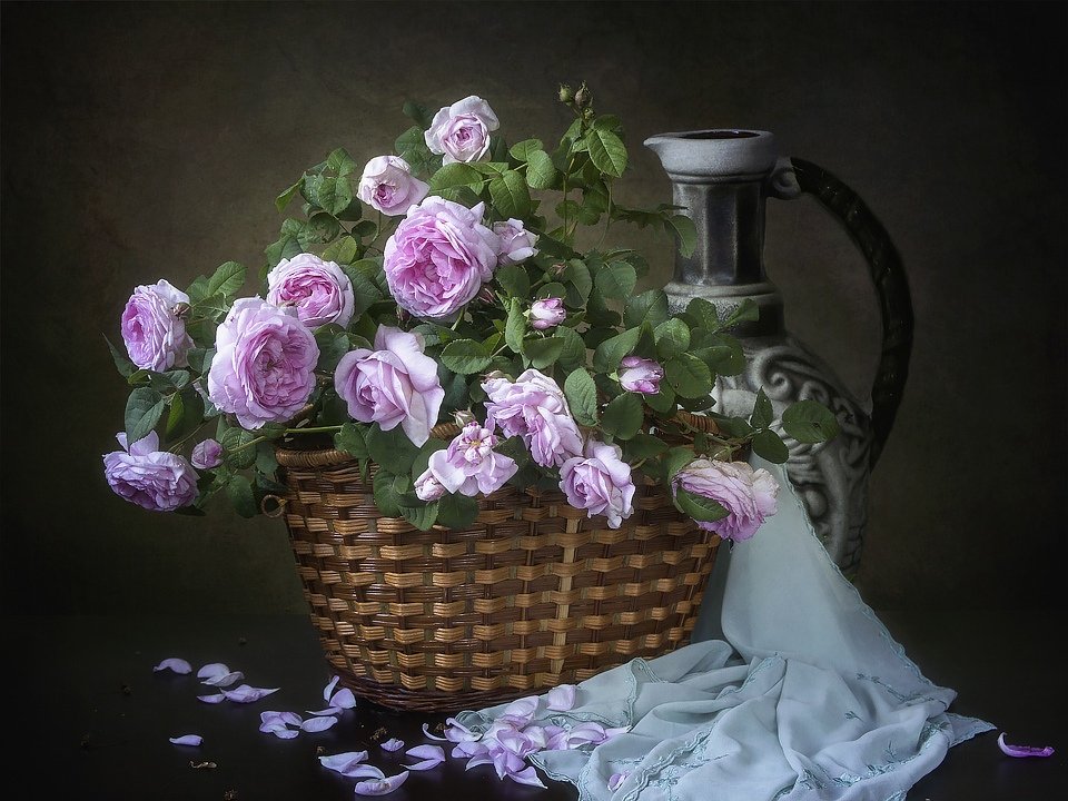 натюрморт, цветы, лето, садовые, розовые розы, корзина, Ирина Приходько