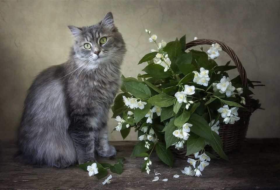 фото животныхдомашние животныепитомцыкошка Масянякорзина чубушникалето