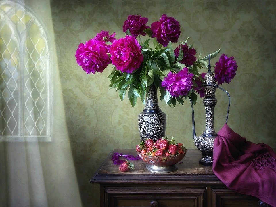 натюрморт, пионы, лето, цветы, пурпурные, восточная посуда, интерьер, Ирина Приходько