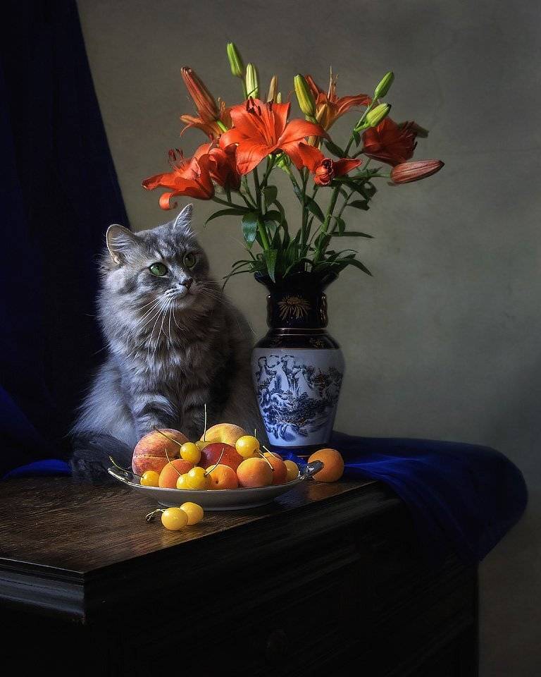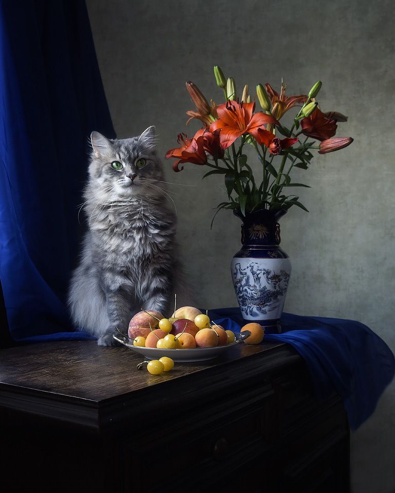 Стала собирать натюрморт и говорю сама себе:" Нужно сделать в контрастных тонах" Масяня тут же вспрыгнула на комод и высунулась из-за вазы, как бы утверждая, что она тоже - контраст.