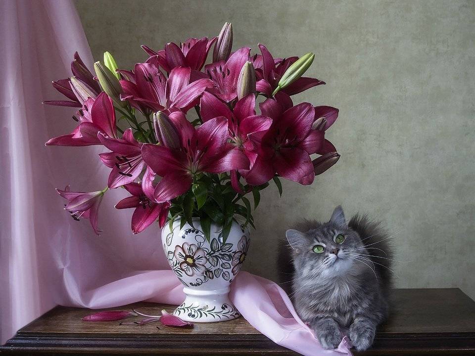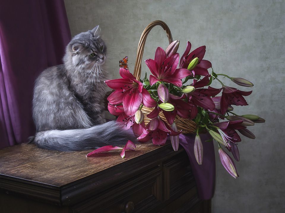домашние животныекошка Масянялетоцветыбукетпурпурные лилии