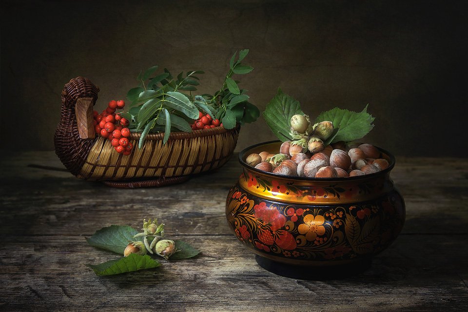 натюрморт, осень, лесные дары, деревянный стол, хохломская посуда, орешки, рябина, Ирина Приходько