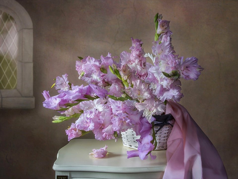 натюрморт, сентябрь, отцветающие гладиолусы, розовые цветы, корзина, , Ирина Приходько