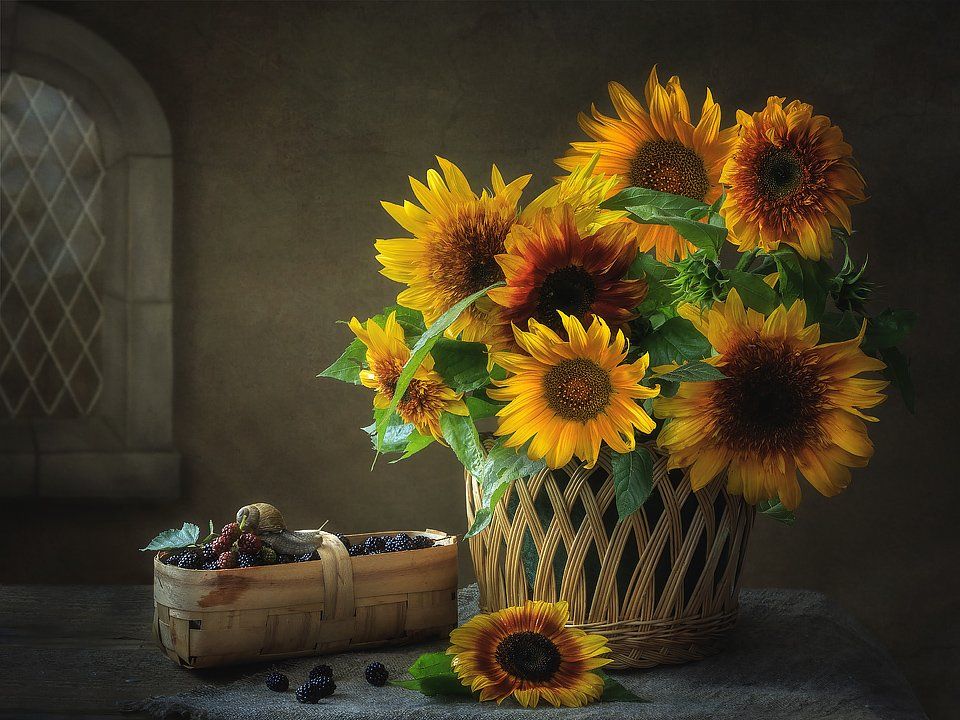 натюрморт, подсолнухи, лето, ежевика, улитка, Ирина Приходько