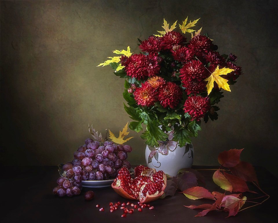натюрморт, цветочный, хризантемы, осень, виноград, осенние листья, гранат, Ирина Приходько