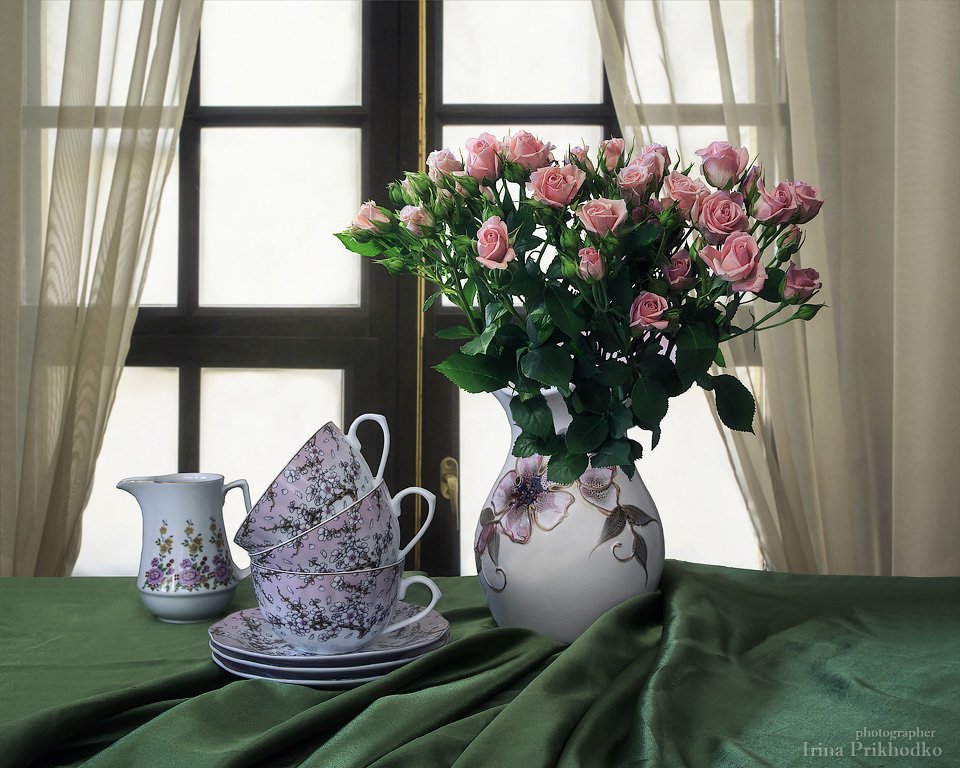 натюрморт, цветочный , букет, кустовые розы, фарфоровая посуда, интерьер, Ирина Приходько