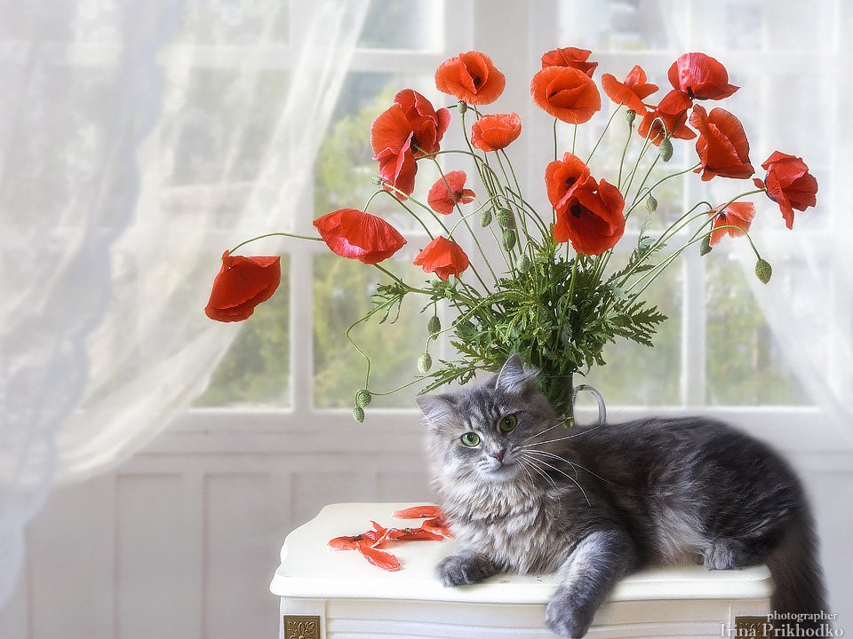 натюрморт, цветочный натюрморт, букет, красные маки, домашние животные, котонатюрморт, кошка Масяня, Ирина Приходько