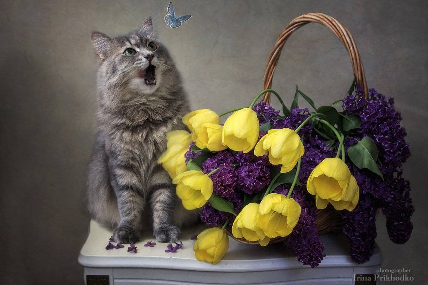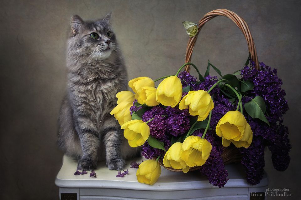цветочный натюрмортбукетыфлористикадомашние животныекошка Масянятюльпанысиреньбабочки