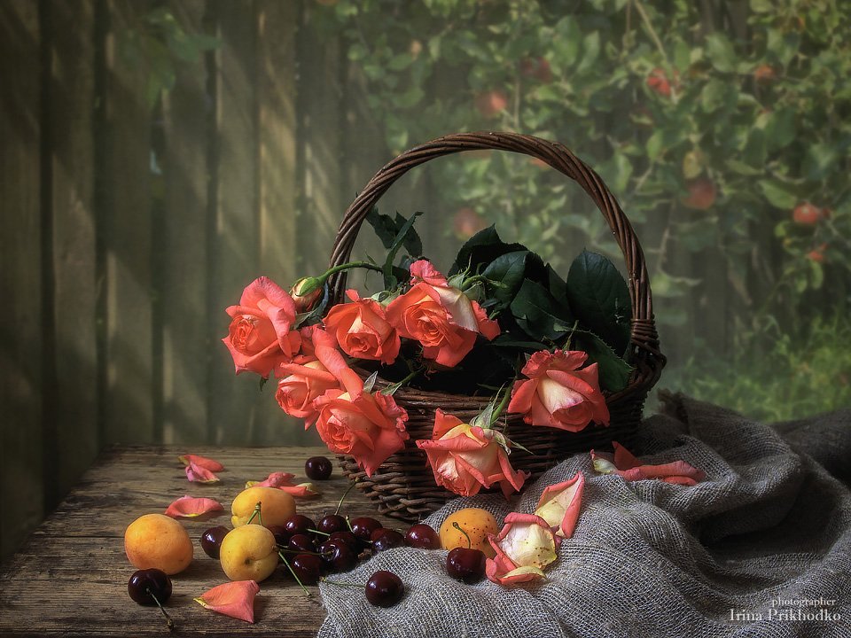 натюрморт, лето, сад, розы, букет, фрукты, урожай, Ирина Приходько