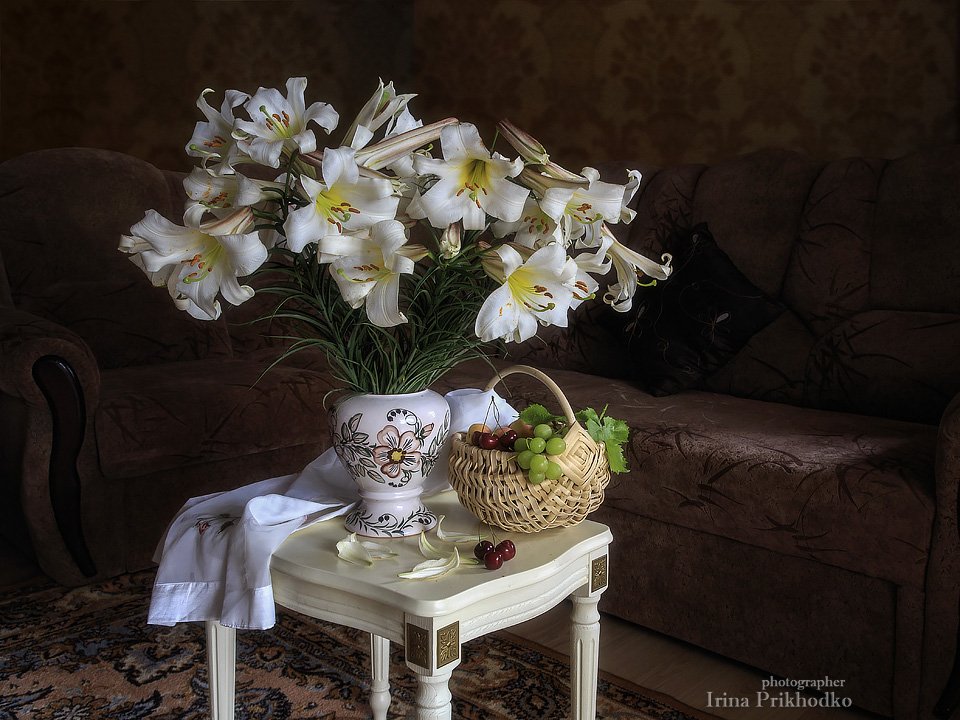 Натюрморт, интерьер, букет, белые лилии, фрукты, Ирина Приходько