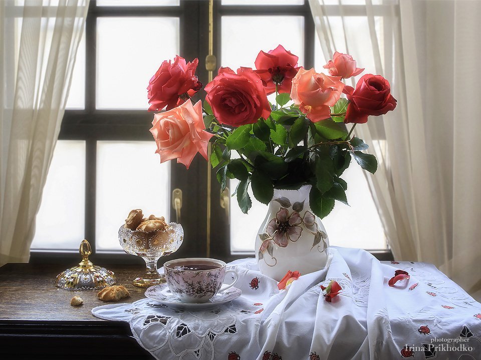 натюрморт, интерьер, букет, розы, чай, лето, Ирина Приходько