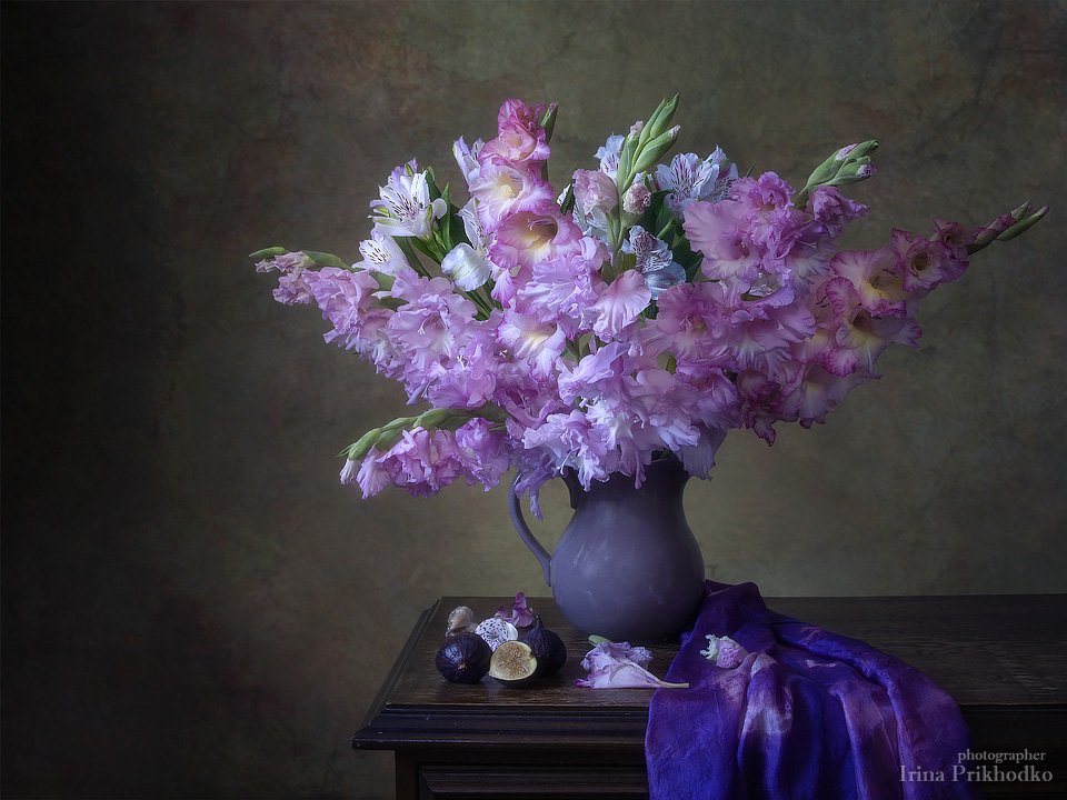 натюрморт, гладиолусы, букет, винтажный натюрморт, фиги, Ирина Приходько