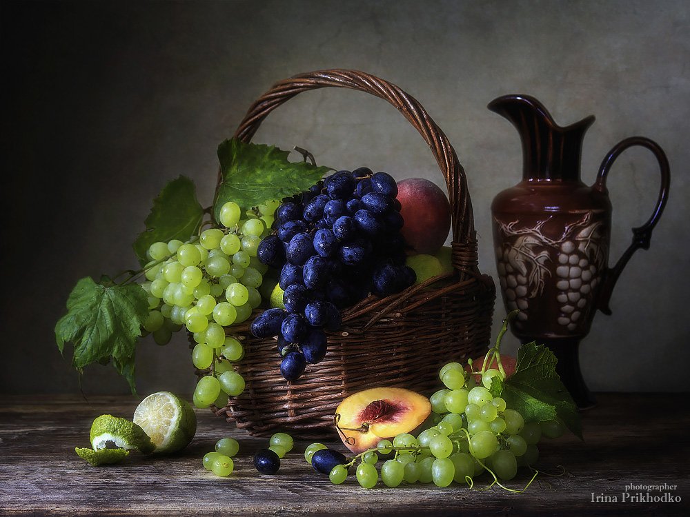 натюрморт, виноград, винтажный, корзина, кувшин, Ирина Приходько