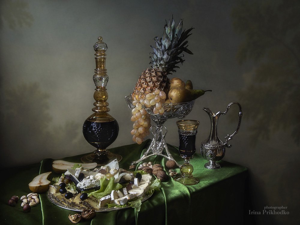 натюрморт, стол, еда, ретро, винтажный стиль, красивая посуда, сырная тарелка, фрукты, вино, Ирина Приходько