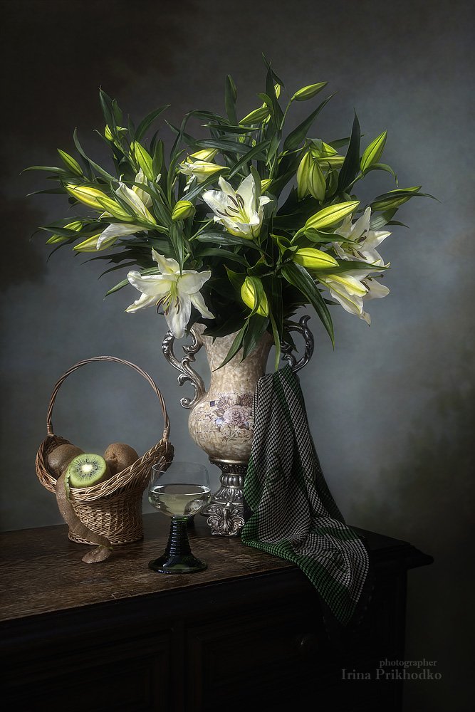 натюрморт, цветочный, винтажный. ретро, фрукты, вино, букет, белые лилии, Ирина Приходько