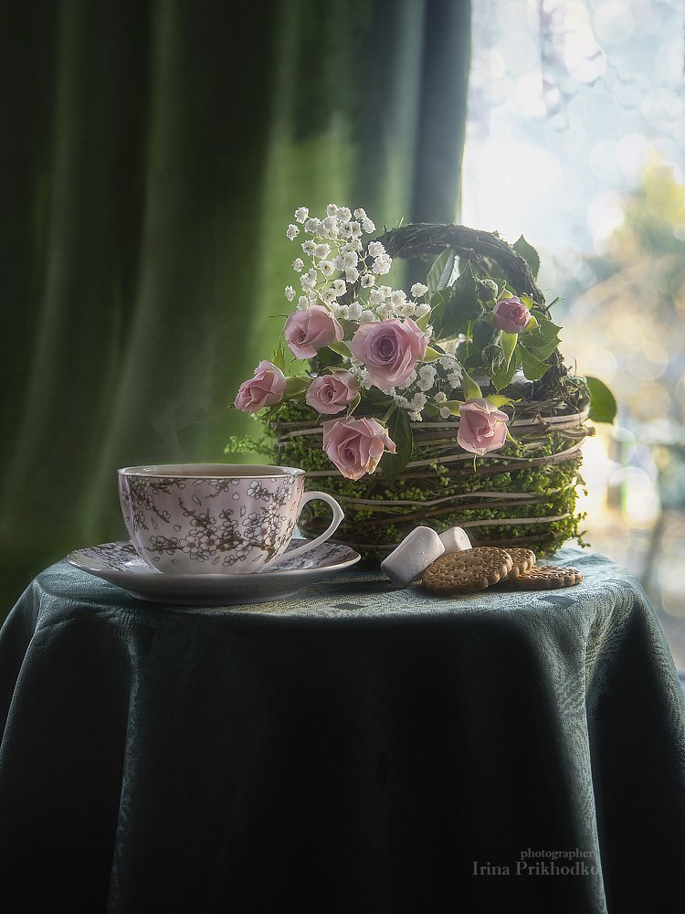 натюрморт, интерьер, окно, чай, цветы, розы, Ирина Приходько