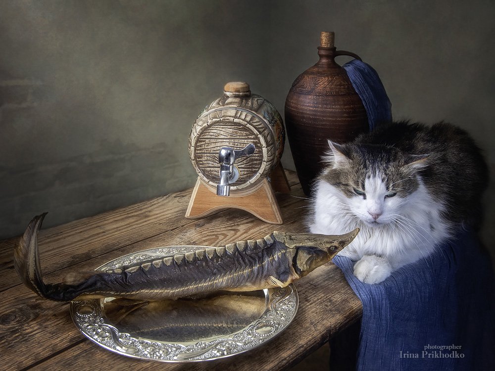 Там накрыт хозяйкой стол,уже рыбка на... кусочки - рад,к Ирине что зашёл,где вина кувшин из бочки. Хочешь белого фужер или красного немного на излюбленный манер,что "подарено от Бога". Тост,как впредь - за милых дам,эстетично угощение, и коту кусочек дам - я в обедни,завершение !