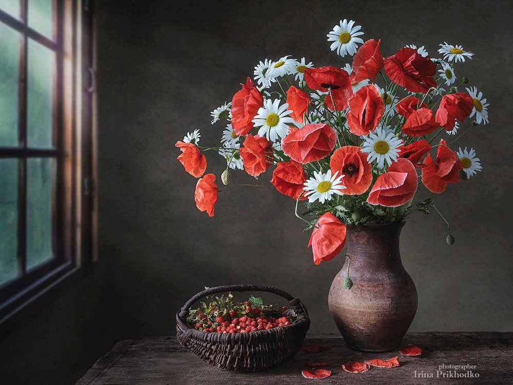 натюрморт, лето, букет, цветы, маки, ромашки, земляника, Ирина Приходько