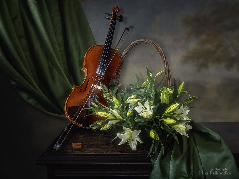 натюрморт, винтажный, ретро, классический, цветочный, букет, лилии, скрипка, Ирина Приходько