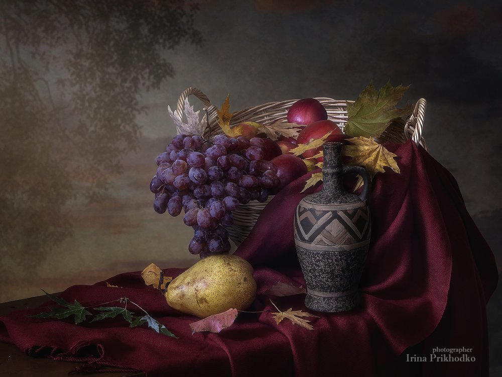 Груша с гроздью и вином,яблоками в листьях - красных,где все мысли об одном,что особенно прекрасно.Незатейливый сюжет с рук прекраснейшей Ирины,что увидит и поэт - вновь в восторге от картины !