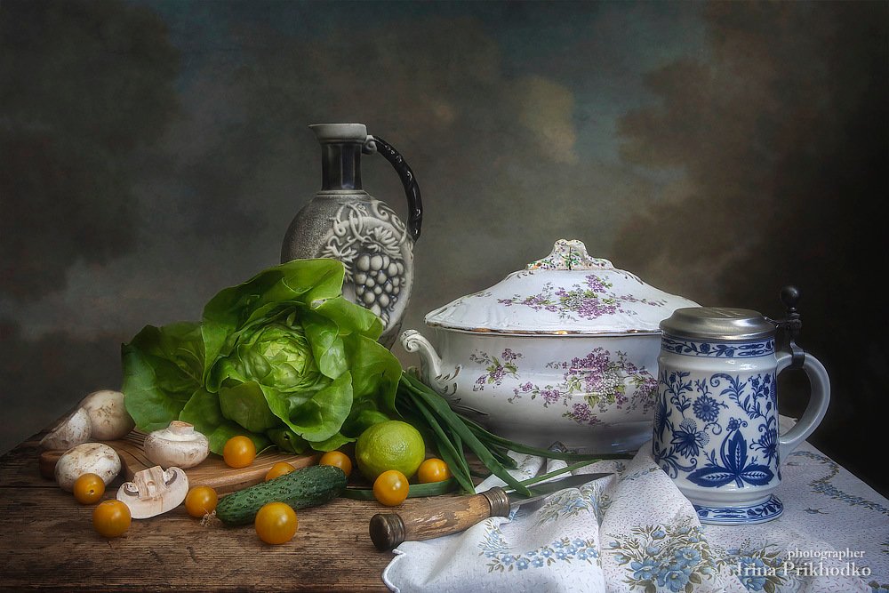 Помидорки цветом "злАтым",шампиньонов вид "резной",восхищён,где я салатом - в натюрморте предо мной!Огурец,что с ароматом,для пикантности лимон,лук порежется туда-то,если в овощи влюблён.