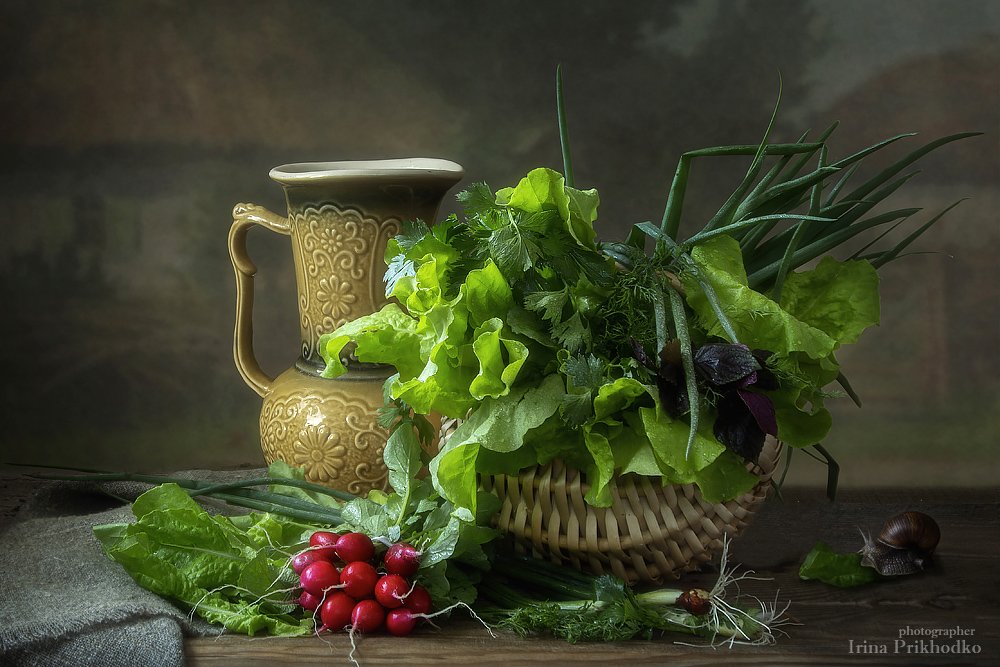 Натюрморт с пучком редиса,в "платье" с зелени салат,где улитка,как актриса,чему тоже очень рад!В тон - базилик с фиолетом и укроп,петрушка,лук - меня радуют при этом,что подметит лета,друг.И закуска овощная Вам уж подана на стол - сочна,спелая.родная,что взрастил зелёный дол...
