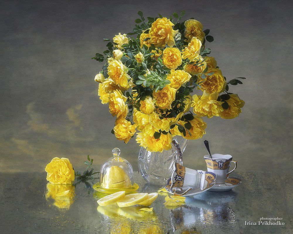 натюрморт, мокрое стекло, отражение, цветочный, кустовые розы, букет, лимон, Ирина Приходько