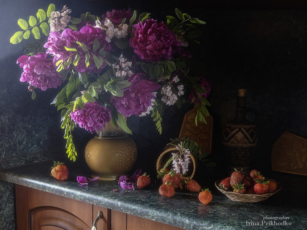натюрморт, букет, пионы, акация, клубника, кухня, художественное фото, Ирина Приходько