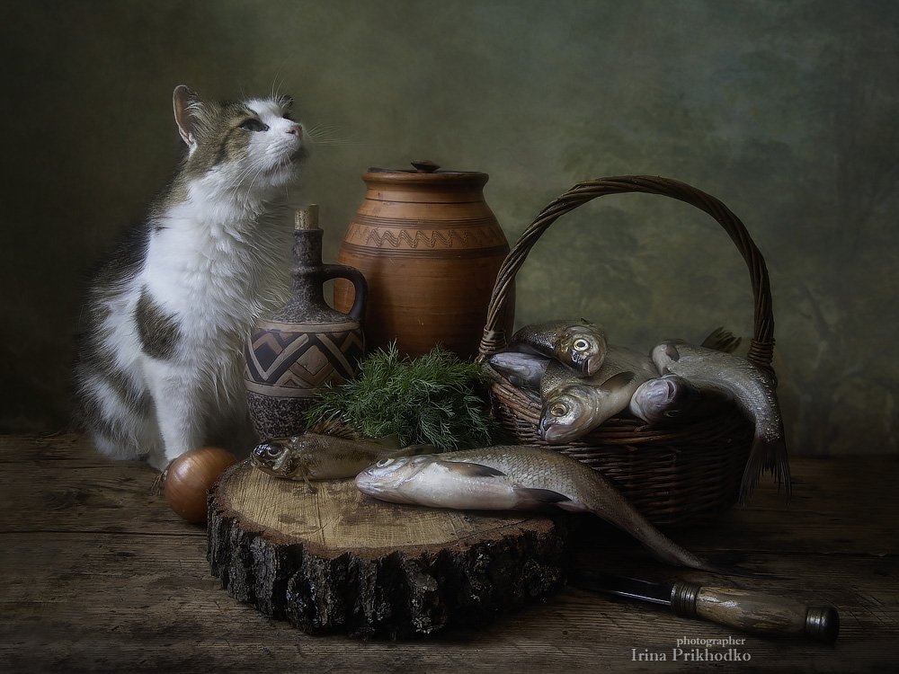 натюрморт, натюркот, зоонатюрморт, рыба, ретро, винтажный, домашние животные, кот Лёва, Ирина Приходько