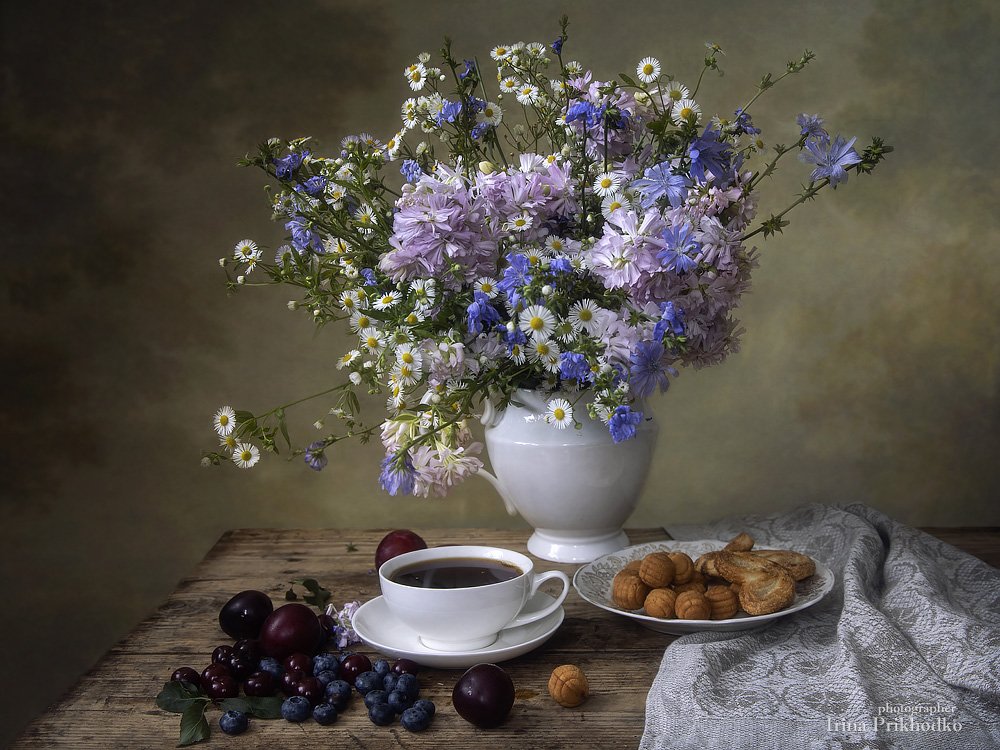 натюрморт, лето, настроение, завтрак, деревенский, букет, полевые цветы, фрукты, печенье, чай, Ирина Приходько
