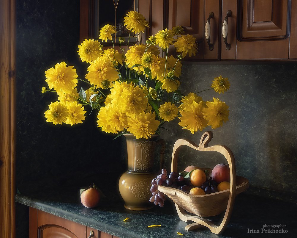 натюрморт, цветы, фрукты, букет, золотые шары, Ирина Приходько