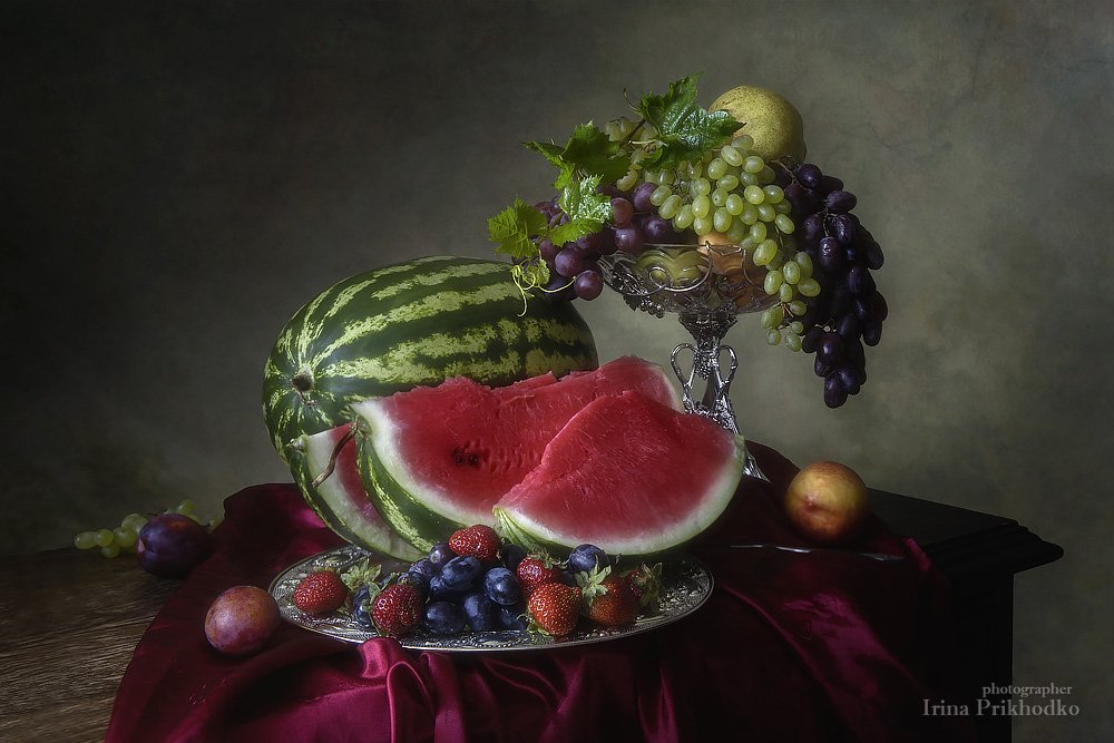 Вазу с гроздью в час дневной,с тонкой "талией"на ножке и тарелку предо мной,с ягод пригоршней,немножко.Где клубники аромат,слив упругих - вдохновение и Ирине очень рад,посвятив стихотворение...