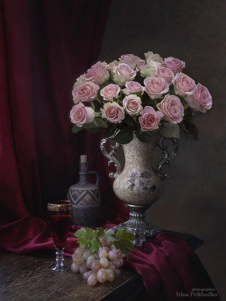 натюрморт, цветы, винтажный, букет, розы, вино, виноград, Ирина Приходько