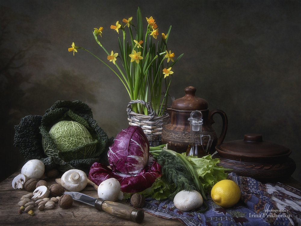 натюрморт, кухня, винтажный, ретро, овощи, нарциссы, цветы, весна, букет, фотокартина, Ирина Приходько
