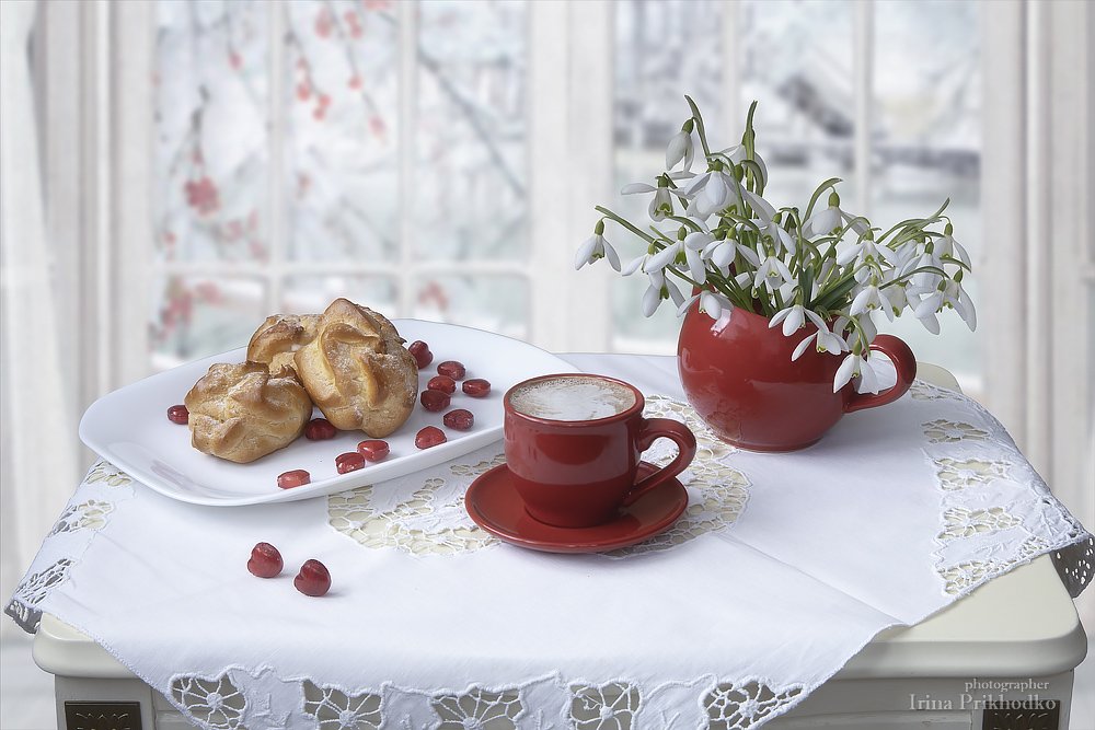 натюрморт, утро, кофейный столик, настроение, цветы, февраль, подснежники, кофе, Ирина Приходько