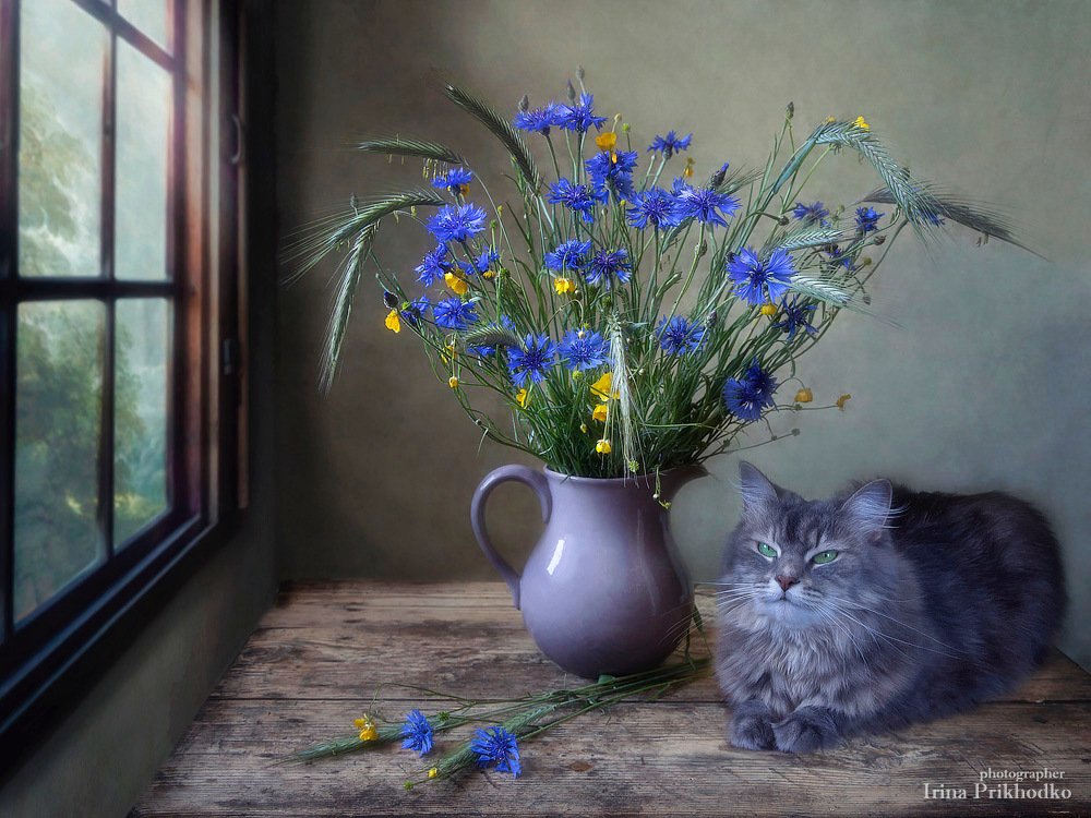 натюрморт, лето, полевые цветы, васильки, питомцы, кошка Масяня, постановочное фото, Ирина Приходько