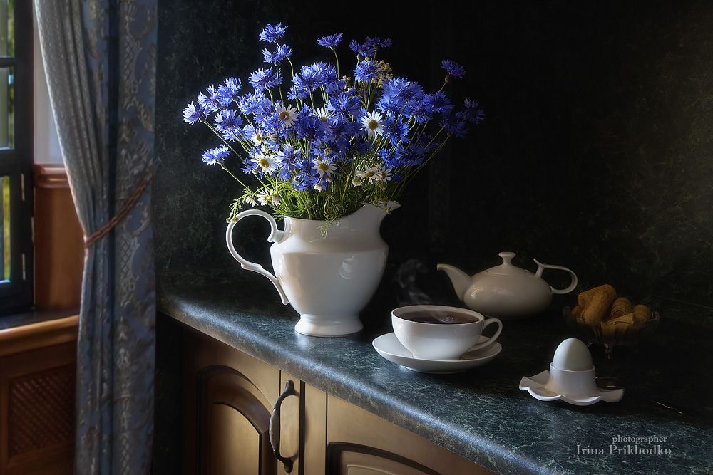 натюрморт, лето, утро, полевые цветы, васильки, завтрак, кухня, Ирина Приходько