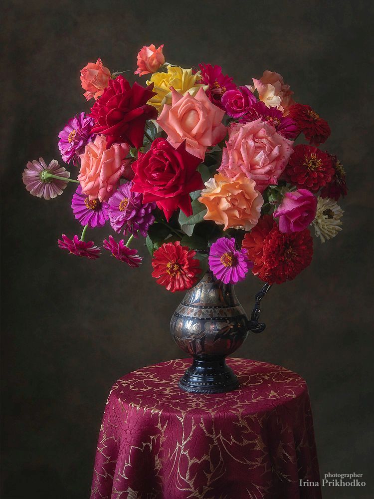 натюрморт, цветы, букеты, розы, цинии, лето, садовые, винтажный, Ирина Приходько