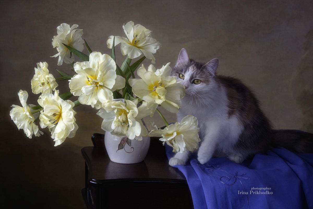 натюрморт, котонатюрморт, букеты, цветы, тюльпаны, котейки, кошки, домашние питомцы, Приходько Ирина